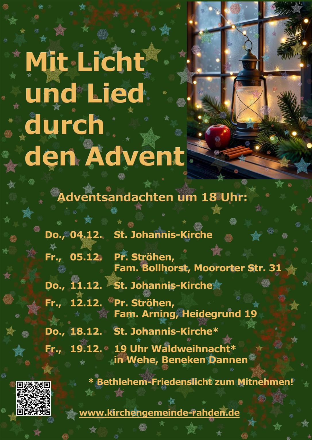 „Ein Licht geht uns auf in der Dunkelheit!“ - Das möchten wir in unseren Kirchengemeinden feiern, auch in diesem Advent. Deshalb laden wir ab dem 4. Dezember wieder donnerstags und freitags um 18 Uhr zu einer Adventsandacht ein. Die Andachten finden in Rahden und in Pr. Ströhen statt – unter dem Motto