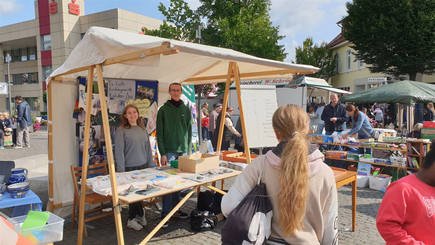 Mit einem Info-Stand auf dem Trödelmarkt 2024 begann die neue Spendenaktion unserer Gemeinde. Team-Mitglieder aus der Konfi- und Jugendarbeit und Presbyteriumsmitglieder warben für die Anliegen der Gemeinde, verteilten Flyer und luden zu Spielen und Gesprächen ein. Spenden für die Konfi- und Jugendarbeit wurden gesammelt, und Geschirrtücher angeboten, die mit Kirchenmotiven bedruckt waren.