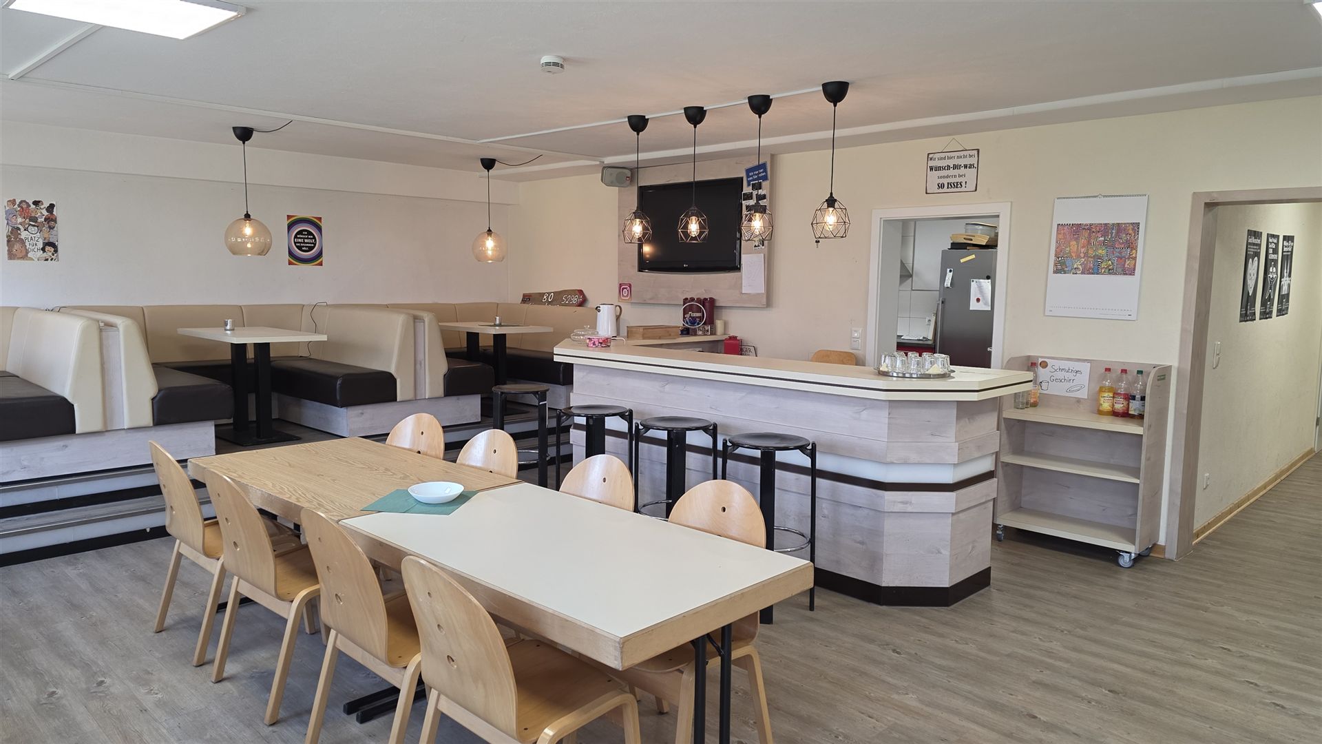 Im Jugendkeller gibt es verschiedene Freizeitangebote wie Tischkicker, Billard, Tischtennis, Air-Hockey und eine Playstation. Zudem stehen Brett- und Kartenspiele zur Verfügung. Musik läuft regelmäßig und wird oft von den Jugendlichen selbst ausgewählt. Der Raum bietet Sofas, Sitzsäcke und verschiedene Bereiche, sodass eine angenehme und abwechslungsreiche Umgebung entsteht.