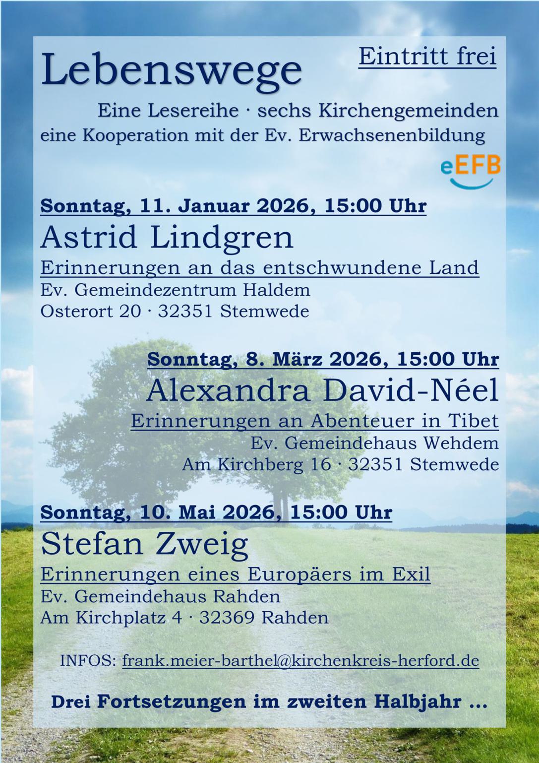 Vor zwei Jahren haben wir uns auf den Weg gemacht und gemeinsam mit den Kirchengemeinden Wehdem, Levern, Oppenwehe, Dielingen/Haldem und Preußisch Ströhen einen Kooperationsraum Nord gegründet. Gemeinsam wollen wir kirchliche Angebote über Gemeindegrenzen hinaus sichtbar machen und Menschen einladen, in andere Kirchen und Gemeindezentren zu kommen. Deshalb haben wir in Zusammenarbeit mit der evangelischen Erwachsenenbildung eine Lesereihe zum Thema "Lebenswege" vorbereitet, zu der wir herzlich einladen: