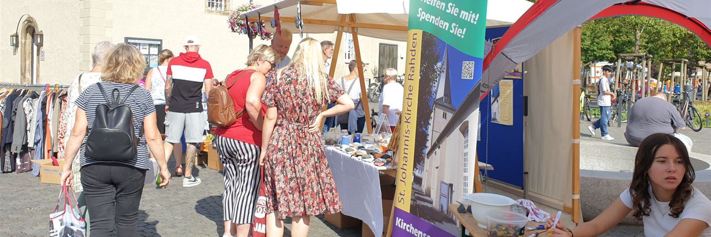 Mit einem Info-Stand auf dem Trödelmarkt 2024 begann die neue Spendenaktion unserer Gemeinde. Team-Mitglieder aus der Konfi- und Jugendarbeit und Presbyteriumsmitglieder warben für die Anliegen der Gemeinde, verteilten Flyer und luden zu Spielen und Gesprächen ein. Spenden für die Konfi- und Jugendarbeit wurden gesammelt, und Geschirrtücher angeboten, die mit Kirchenmotiven bedruckt waren.