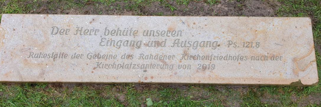 Ein Gedenkstein macht nun die Stelle für die Friedhofsbesucher kenntlich. Der Stein, eine ehemalige Stufe der St. Johannis-Kirche, enthält folgendes Bibelwort aus Psalm 121, Vers 8: „Der Herr behüte unseren Ausgang und Eingang.“ Zudem ist er mit folgendem Zusatz beschriftet: „Ruhestätte der Gebeine vom historischen Friedhof an der Rahdener Kirche nach der Sanierung 2019“.