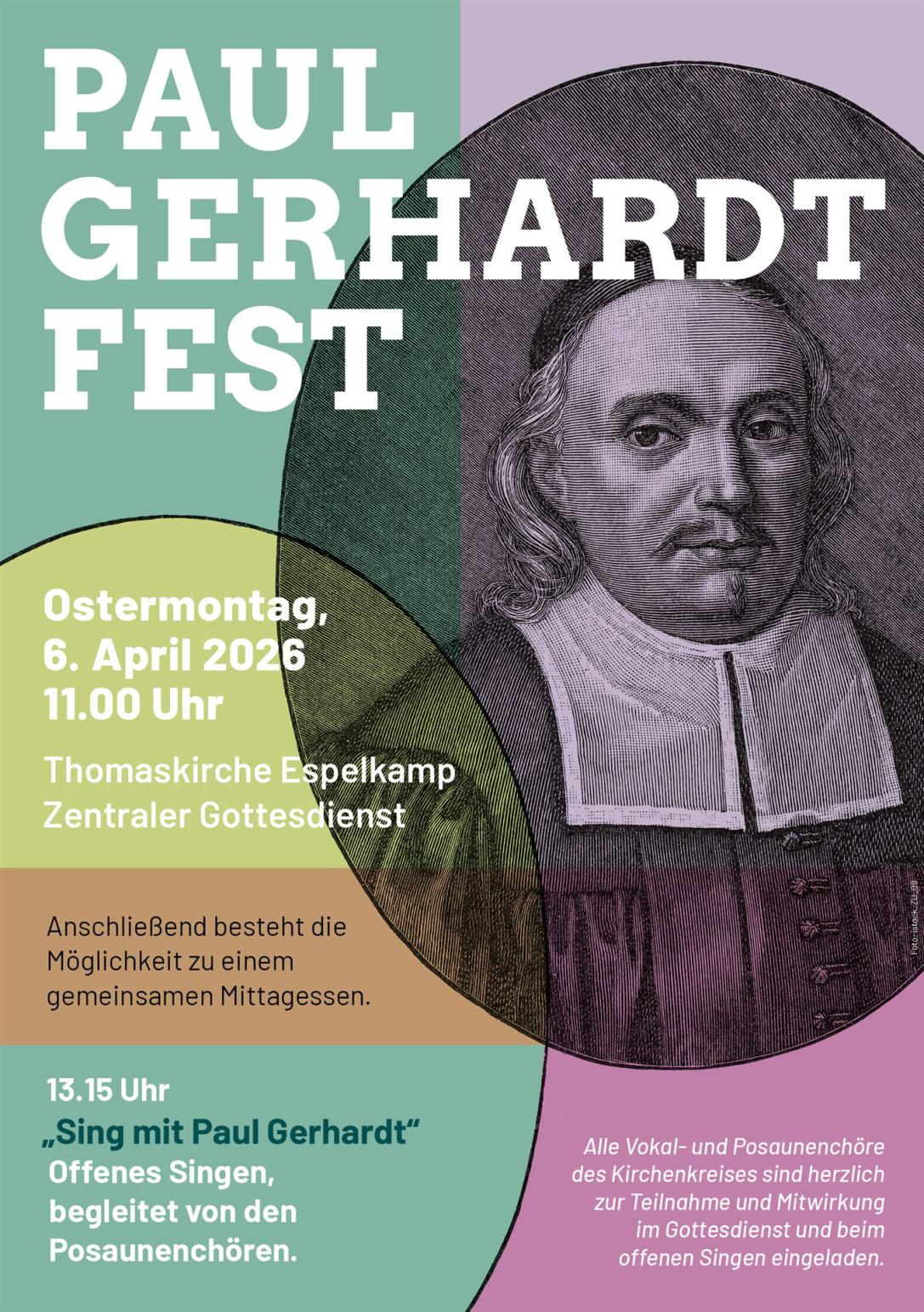 In diesem Jahr begehen wir seinen 350. Todestag. Aus diesem Anlass feiert der Kirchenkreis Lübbecke am Ostermontag, den 6. April, ein Paul-Gerhardt-Fest. Es beginnt um 11 Uhr mit einem Festgottesdienst in der Thomaskirche in Espelkamp, es schließt sich ein Mittagessen an, und ab 13.15 Uhr folgt – unter Mitwirkung aller Posaunenchöre des Kirchenkreises - ein Offenes Singen unter der Überschrift: „Sing mit Paul Gerhardt!“