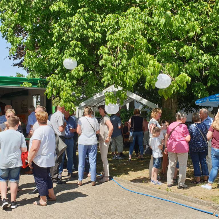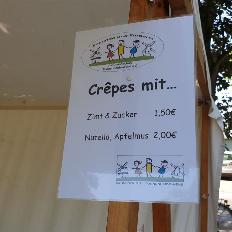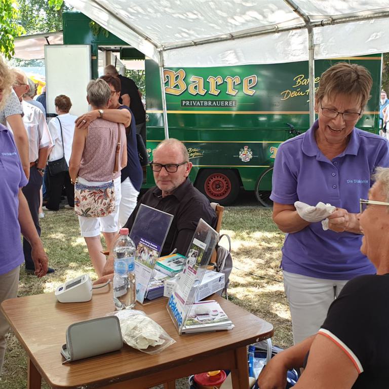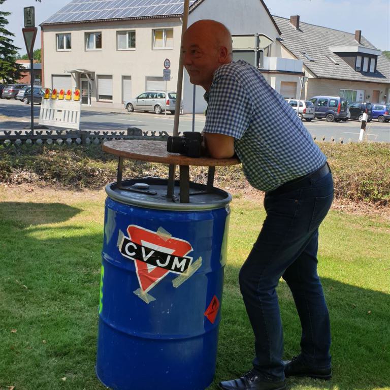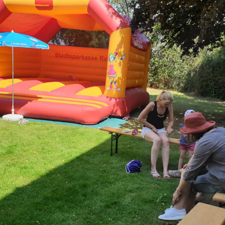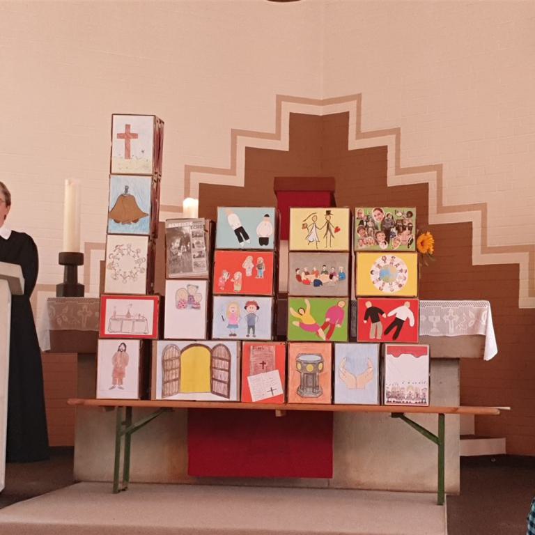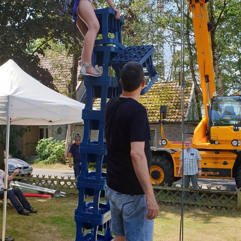 Ein Bläserständchen empfing die Gemeinde anschließend draußen und gab Gelegenheit, sich in Ruhe dem vielfältigen Angebot rund um die Kirche zu nähern. Viele Vereine und Institutionen der Dorfgemeinschaft sorgten für ein abwechslungsreiches Programm: Eine Bauaktion für Kinder nahm das Thema des Tages auf, eine Hüpfburg sowie ein Spielmobil sorgten für den nötigen Bewegungsausgleich. Ganz Mutige wagten sich nachmittags beim Kistenklettern unter Anleitung des CVJM in luftige Höhen. Fotowände und Diashows erinnerten an den Kirchbau und an besondere Ereignisse im Gemeindeleben von Tonnenheide. Bei einem kurzweiligen Quiz konnte jeder die eigenen Kenntnisse über die Christuskirche testen und vertiefen. Der Heimatverein präsentierte Bilder aus der Dorfgeschichte, und der Stand der DIAKONIE informierte über wichtige Beratungsangebote.