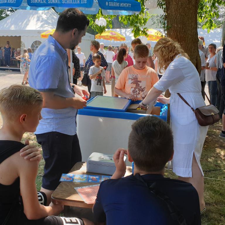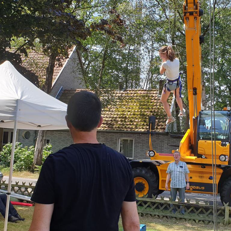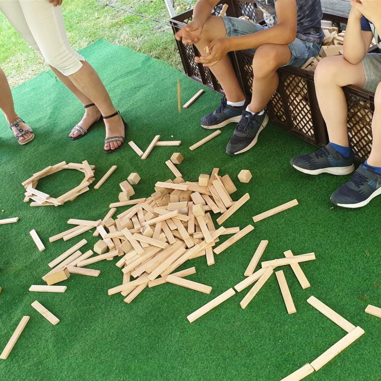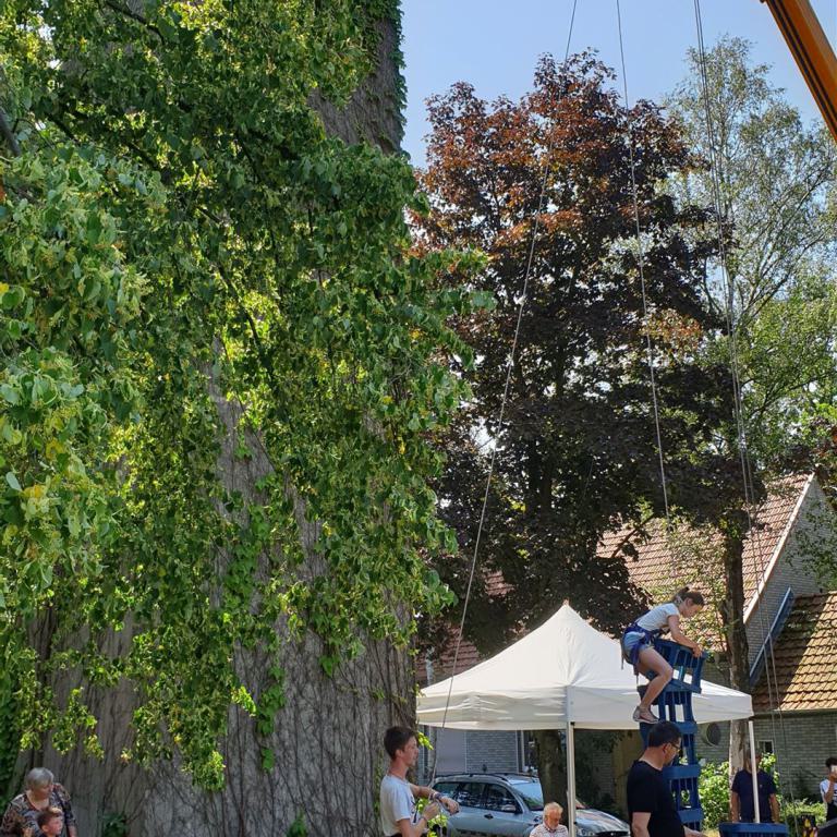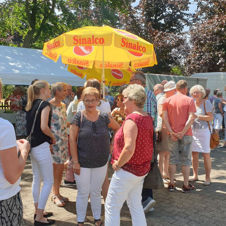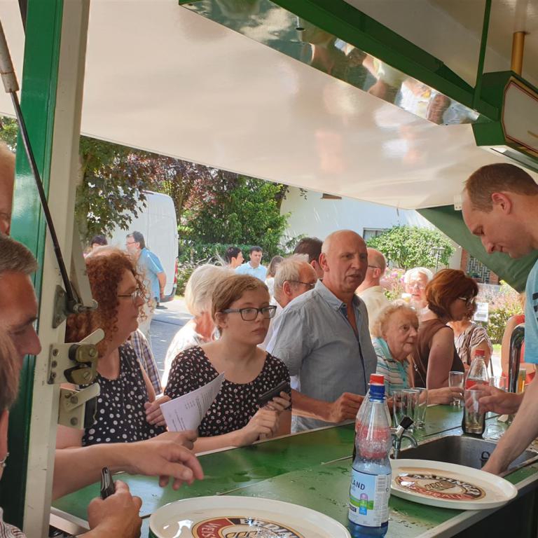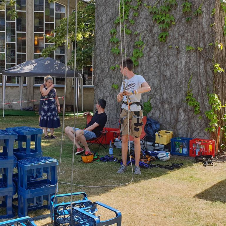 Ein Bläserständchen empfing die Gemeinde anschließend draußen und gab Gelegenheit, sich in Ruhe dem vielfältigen Angebot rund um die Kirche zu nähern. Viele Vereine und Institutionen der Dorfgemeinschaft sorgten für ein abwechslungsreiches Programm: Eine Bauaktion für Kinder nahm das Thema des Tages auf, eine Hüpfburg sowie ein Spielmobil sorgten für den nötigen Bewegungsausgleich. Ganz Mutige wagten sich nachmittags beim Kistenklettern unter Anleitung des CVJM in luftige Höhen. Fotowände und Diashows erinnerten an den Kirchbau und an besondere Ereignisse im Gemeindeleben von Tonnenheide. Bei einem kurzweiligen Quiz konnte jeder die eigenen Kenntnisse über die Christuskirche testen und vertiefen. Der Heimatverein präsentierte Bilder aus der Dorfgeschichte, und der Stand der DIAKONIE informierte über wichtige Beratungsangebote.
