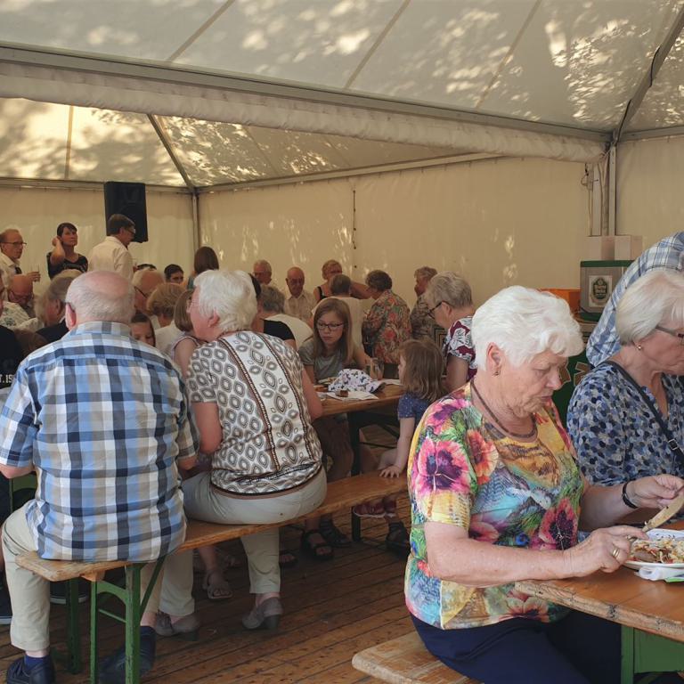 Ein Höhepunkt war dann das Spiel der Plattdeutschen Puppenbühne Varl, die das Stück „Stadtmus und Landmus“ aufführte. Eingeleitet wurde diese Darbietung durch einen Auftritt der Kindergartenkinder der DRK-Tageseinrichtung „Flohkiste“ in Tonnenheide. Nach dem Schlussapplaus ging es draußen weiter mit Tanzdarbietungen von Kindern des Tuspo Rahden und einem gemeinsamen Singen, unterstützt vom Männergesangverein. Natürlich wurden auch noch die Lösungen zum Kirchenquiz verraten und die Sieger gekürt. Schließlich klang das Fest, das von reichlich Sonnenschein "gesegnet" war, dann mit dem Segen aus.